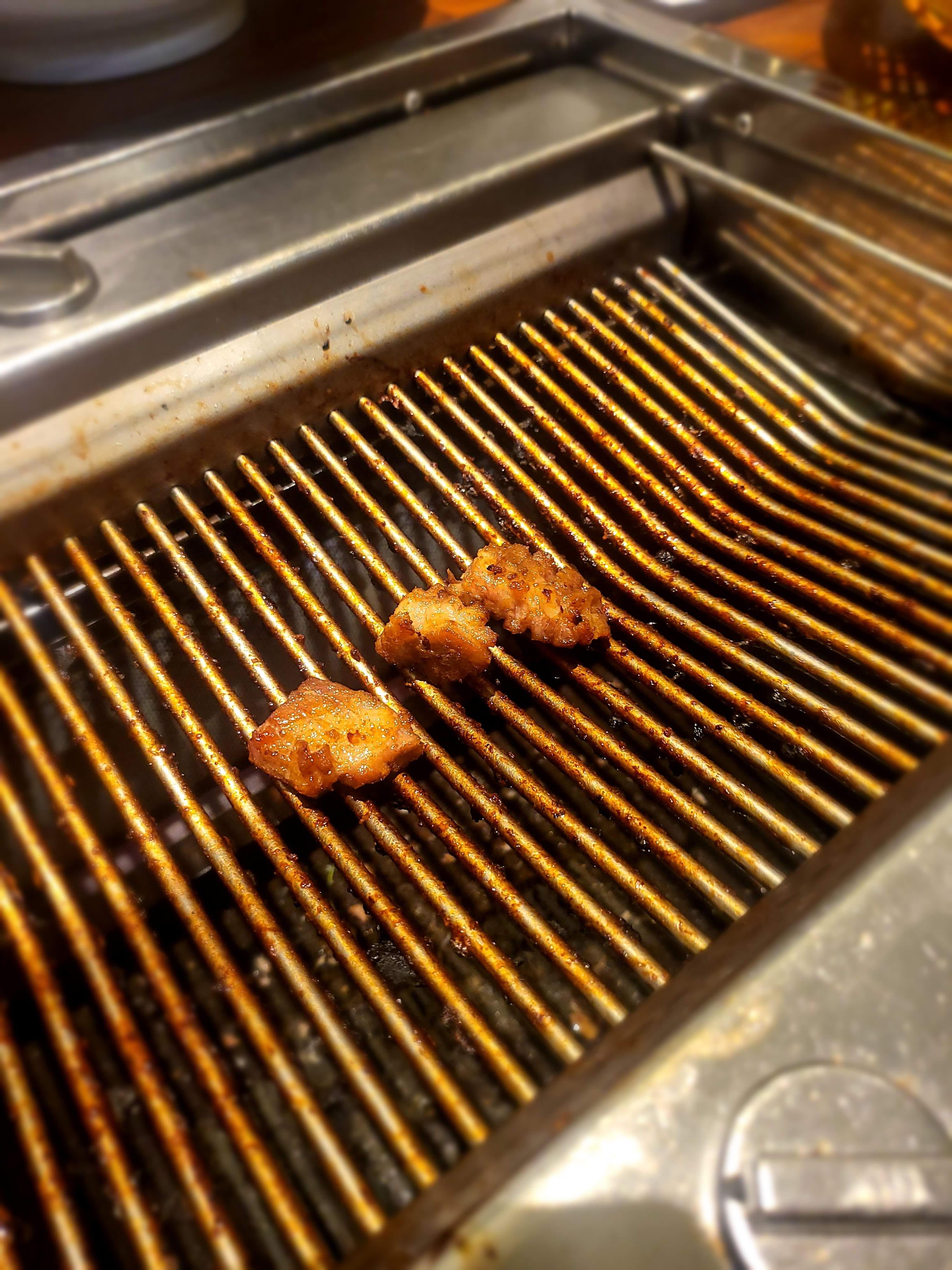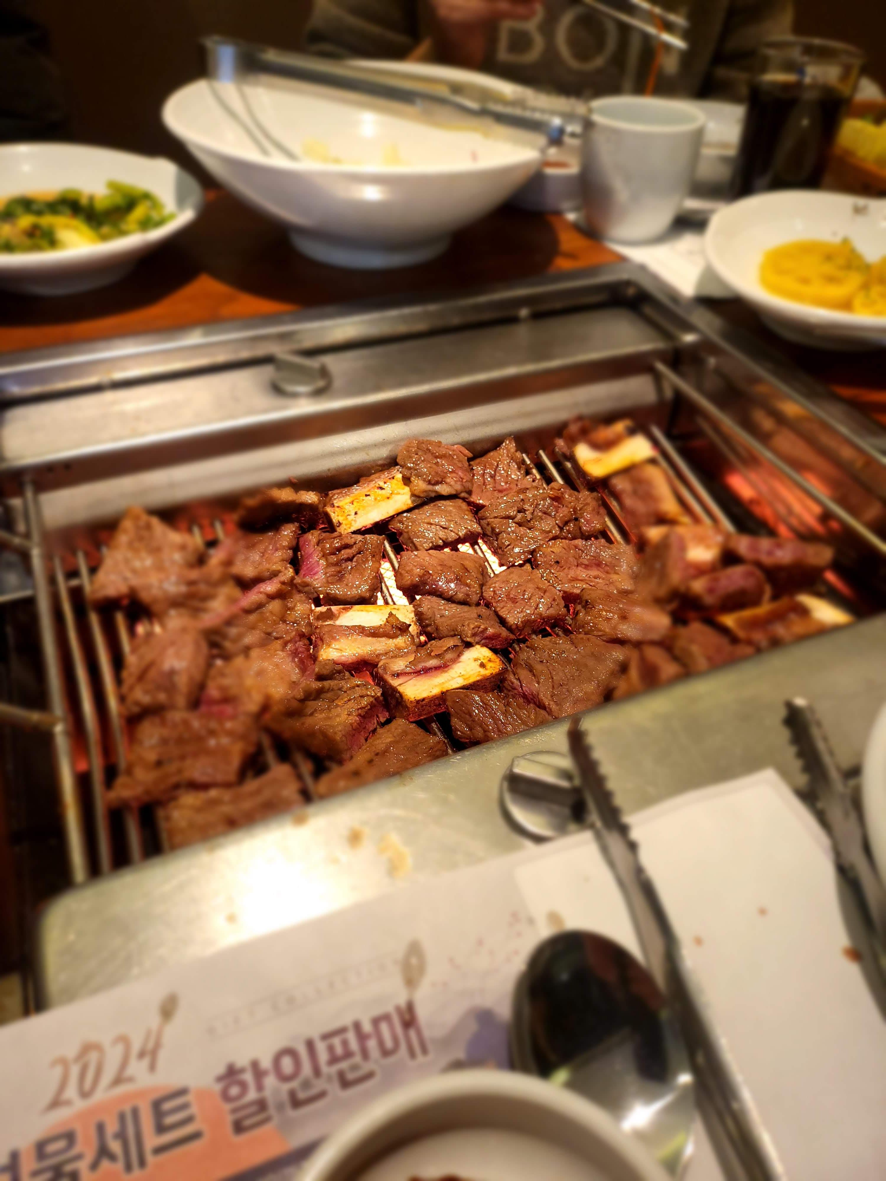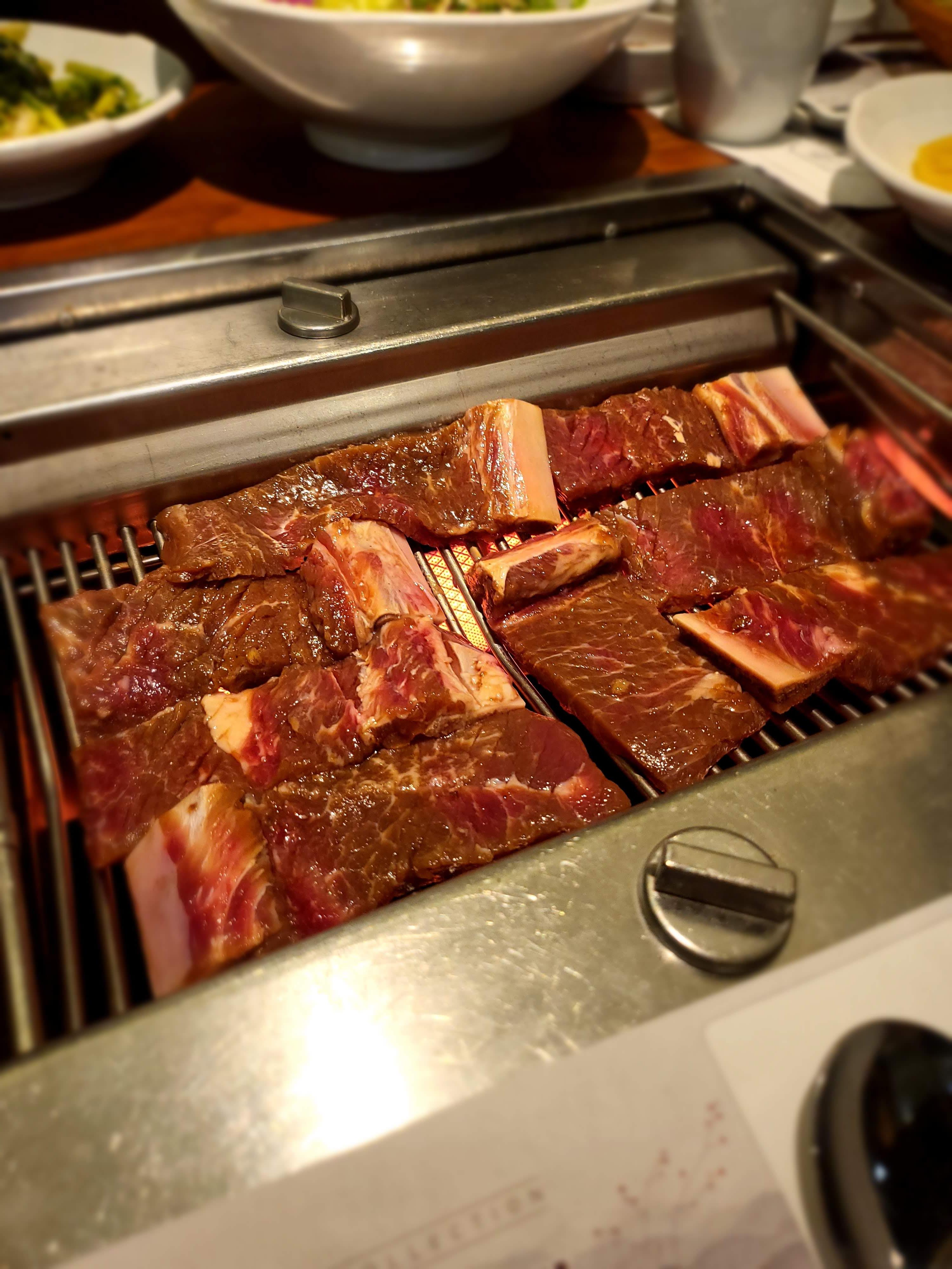 주문한 갈비가 나와서 불 위에 올렸습니다. 이날 느낀 건데 이 집은 고기 굽는 냄새가 다른 고기집에 비해 덜 납니다. 숯을 사용하지 않고 스토브를 사용하는 점과 화구에 장착된 환풍기가 꽤 효과적이라는 생각이 들었습니다.