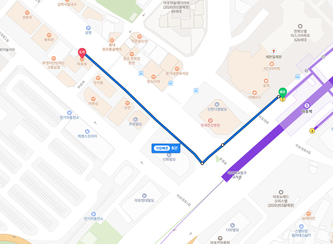 지하철 5호선 마포역 1번 출구에서 도보 5분 안쪽입니다. 차를 가지고 가실 거면 지도 좌측에 있는 마포유수지주차장을 이용하시면 됩니다.