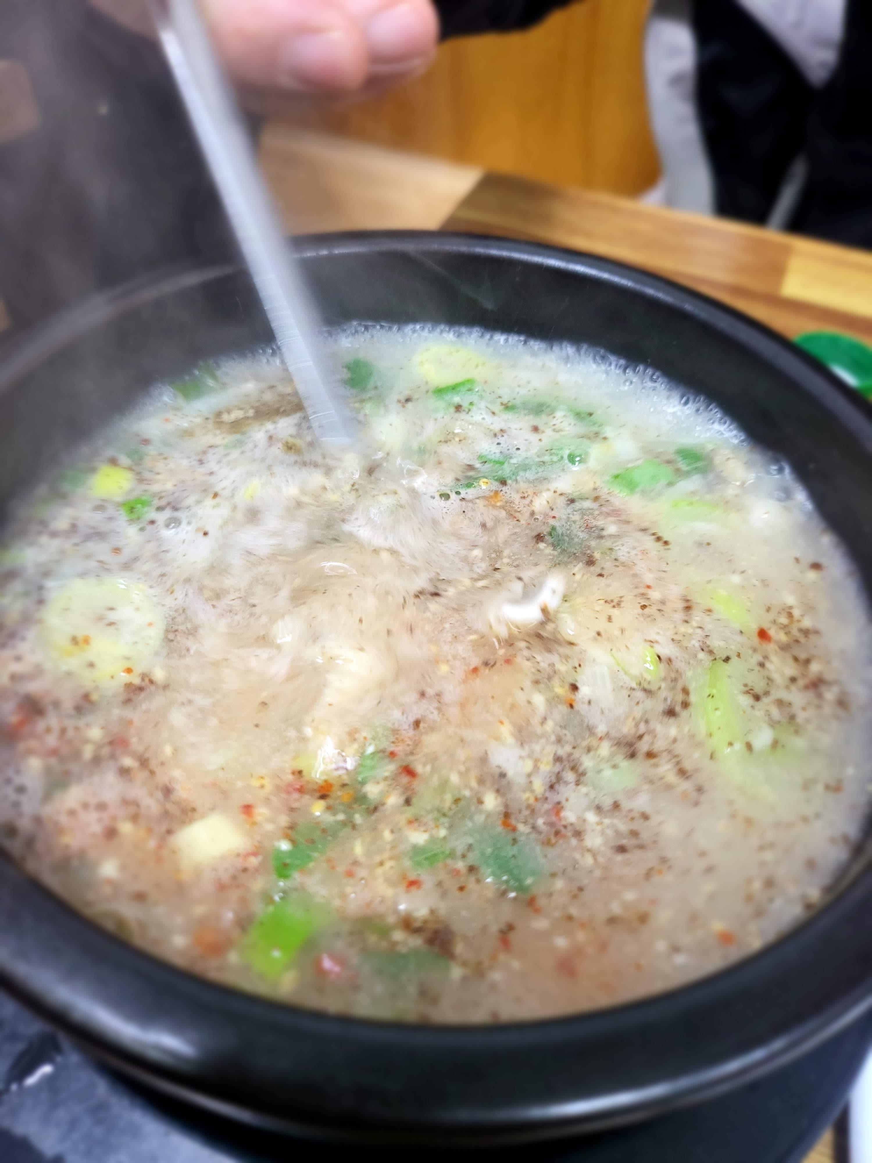 서비스로 나온 순대국물입니다. 위에 떠있는 다대기가 잘 섞이라고 휘휘 저어봅니다.