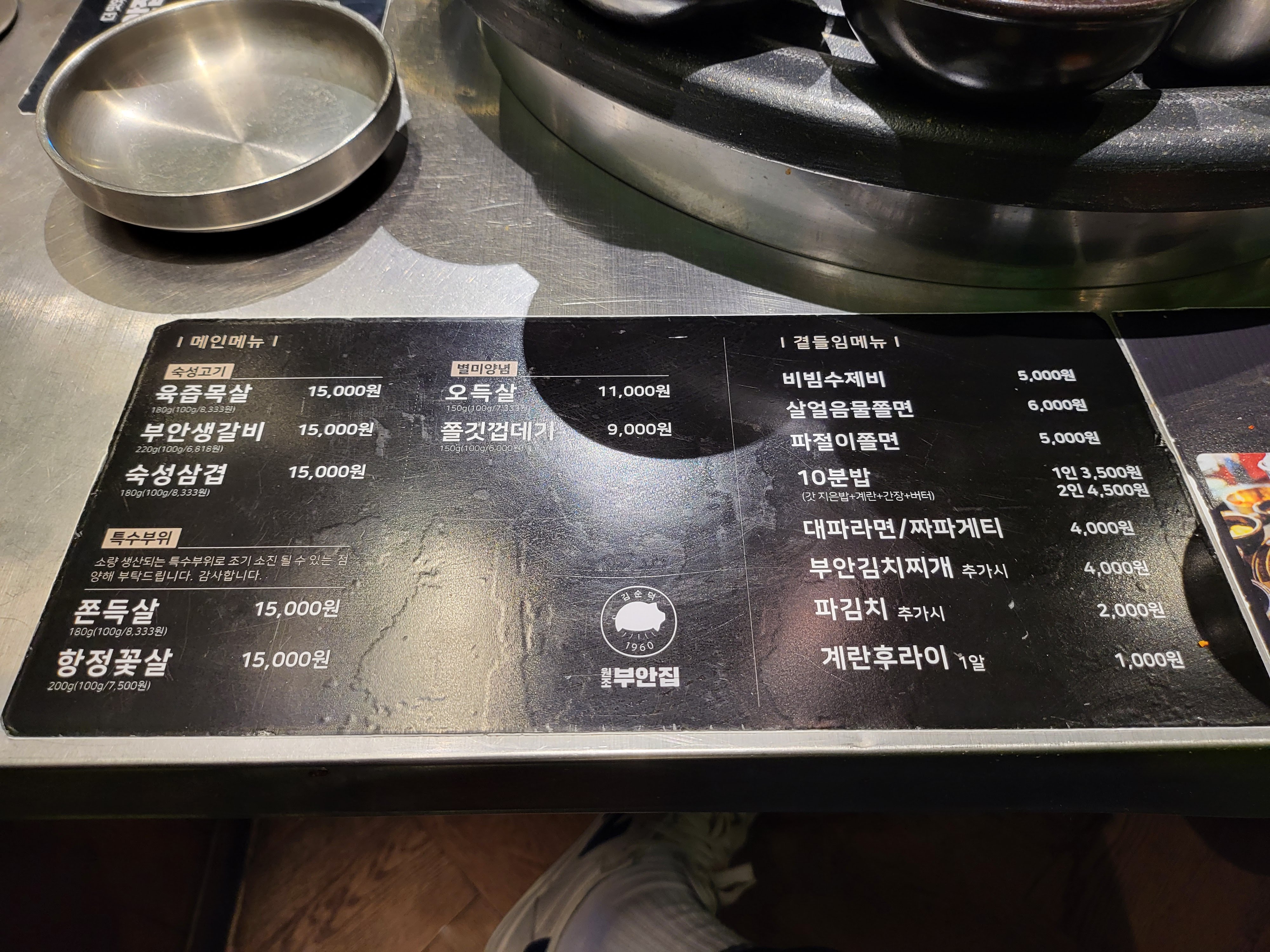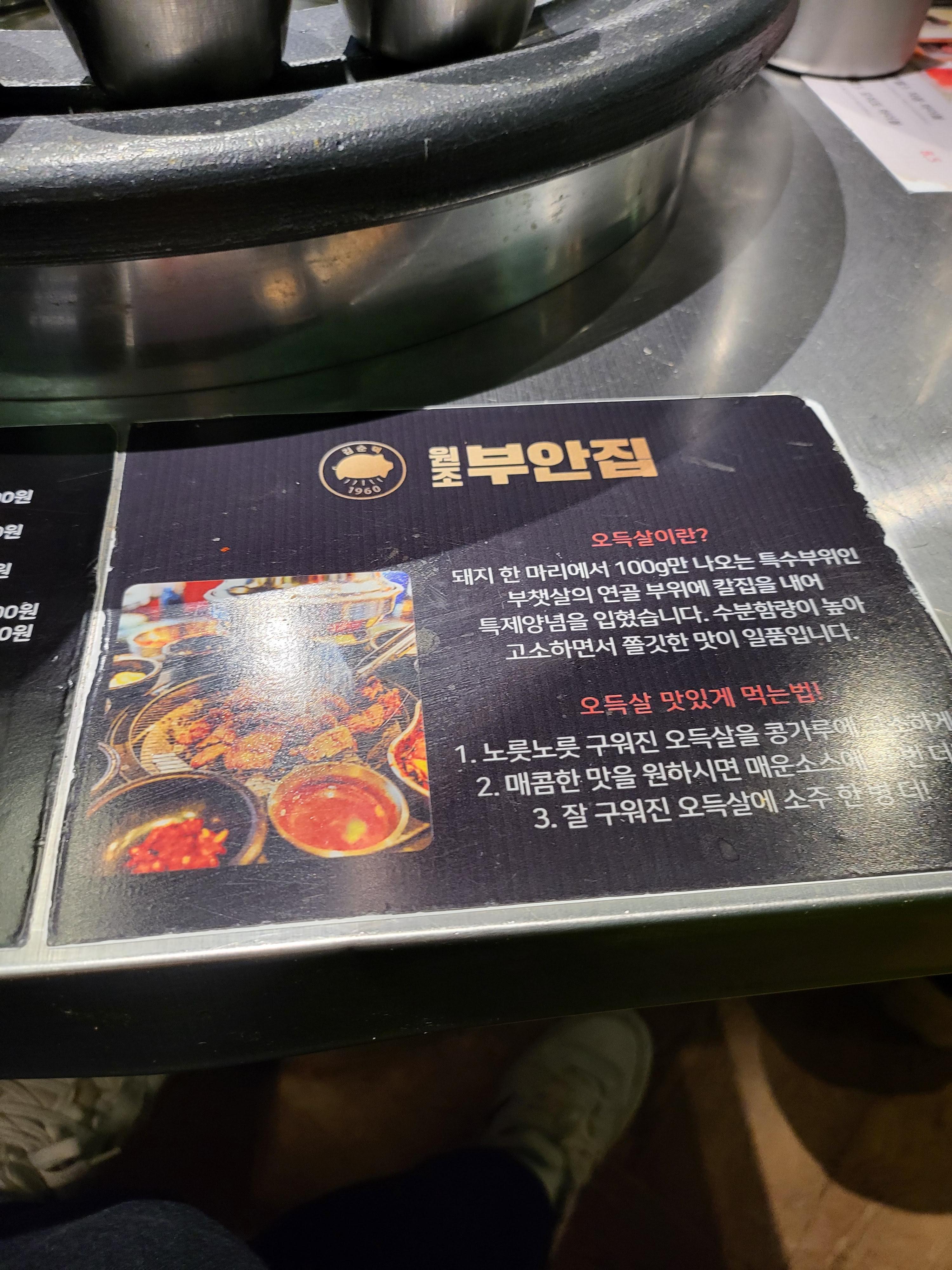 테이블에 붙어있는 메뉴 및 설명이네요. 저희는 먼저 육즙목살을 주문했습니다.