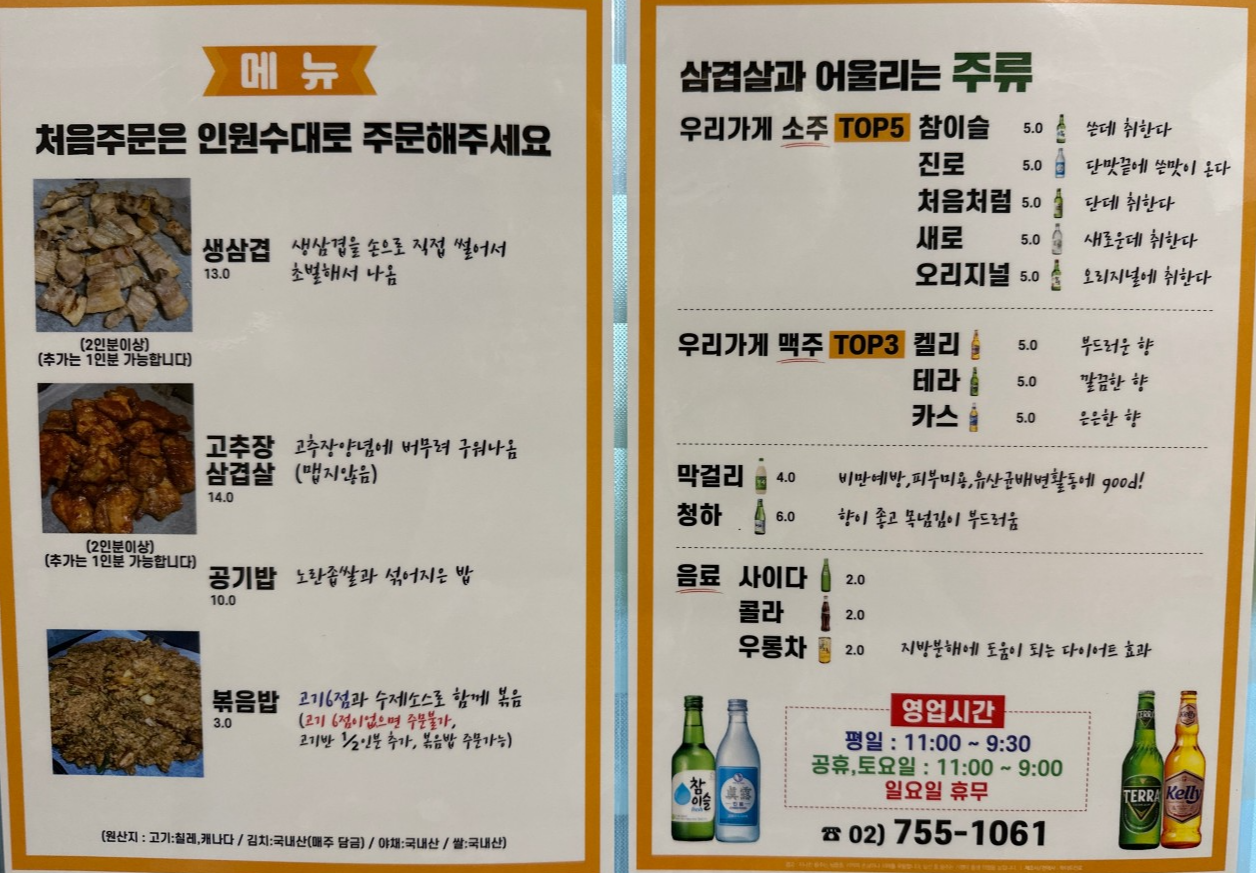 가격도 좋습니다. 요즘 어간한 곳은 삼겹살이 만원 후반대입니다. 그런데 이집은 꽤 오랜동안 이 가격을 유지하고 있습니다. 주류 또한 저렴한 편에 속합니다. 그리고 손님이 북적이는데도 직원들이 꽤나 친절합니다.