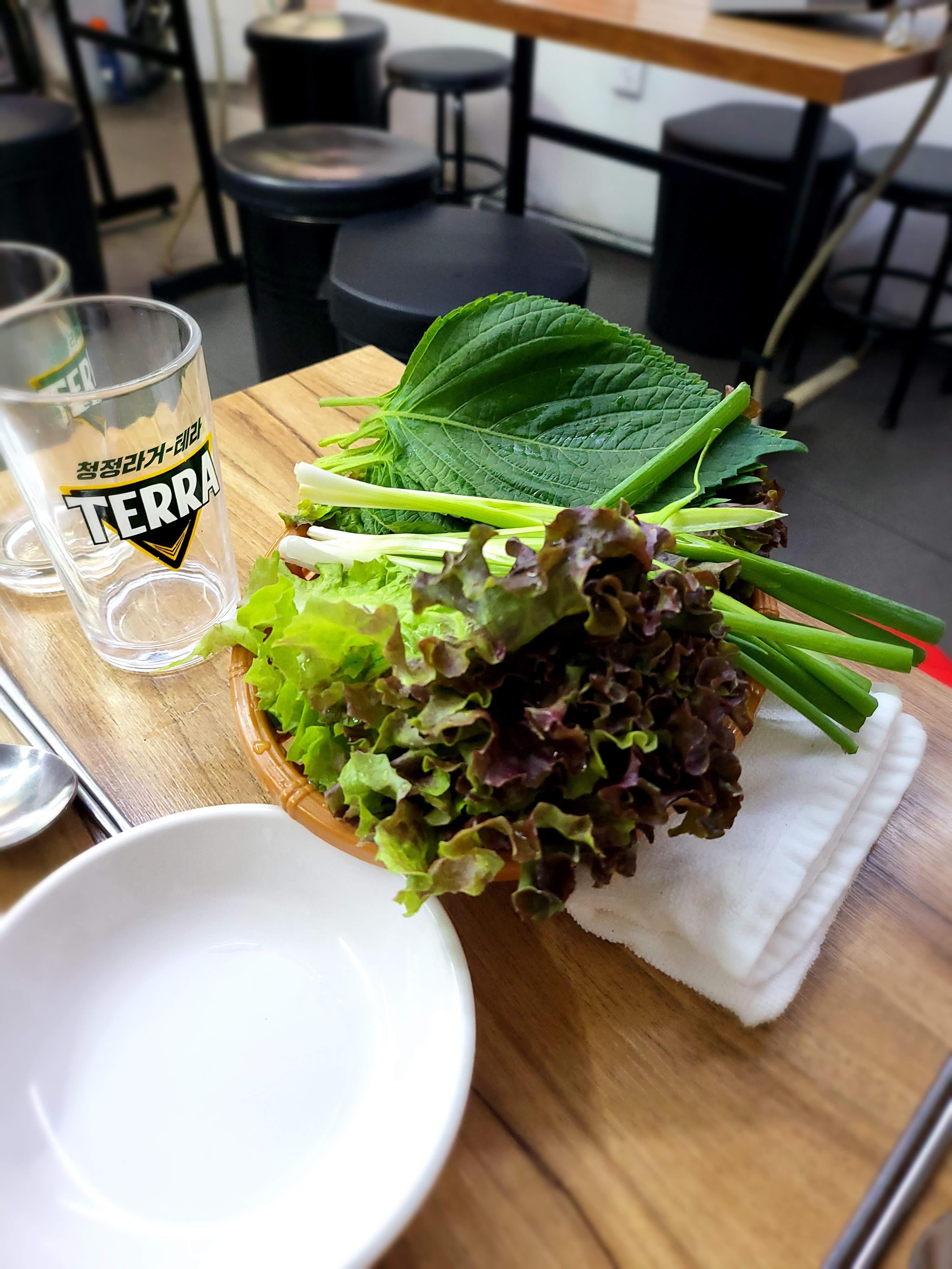 쌈으로 나오는 상추, 깻잎, 쪽파 입니다. 손님이 많은 가게여서 야채들이 아주 싱싱하고 무엇보다 쌈채의 구성 중에 쪽파가 있다는 게 마음에 듭니다. 간혹 족발집 등에서 쪽파가 나오는 경우가 있는데 어쨌든 개인적으로 쪽파가 고기 쌈과 아주 잘 어울린다고 생각합니다