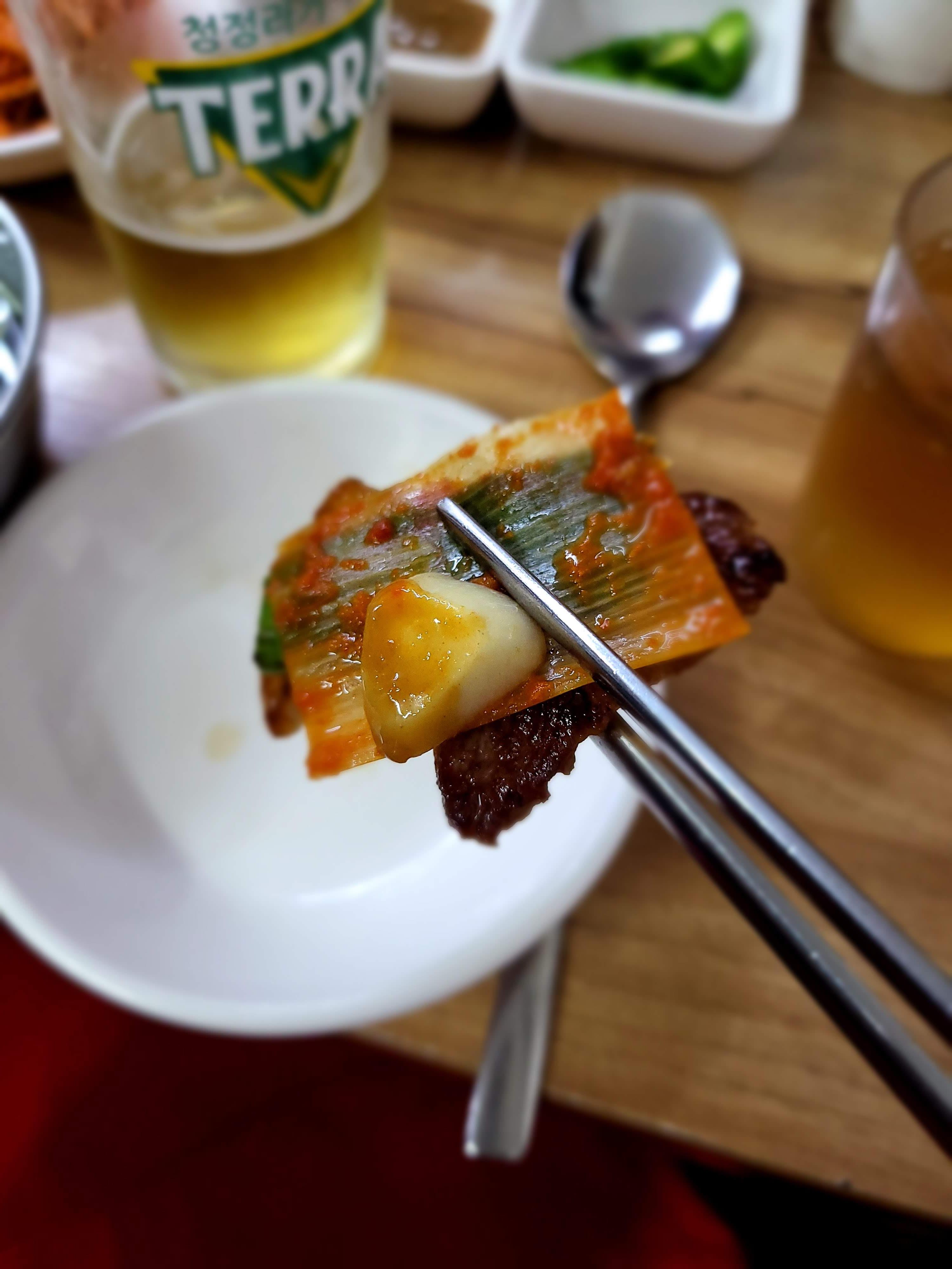 처음에는 삼겹살, 대파김치, 마늘 조합으로 한 입 해봅니다. 대파김치의 시큼함과 마늘의 알싸함이 삼겹살의 풍미를 끌어 올려줍니다