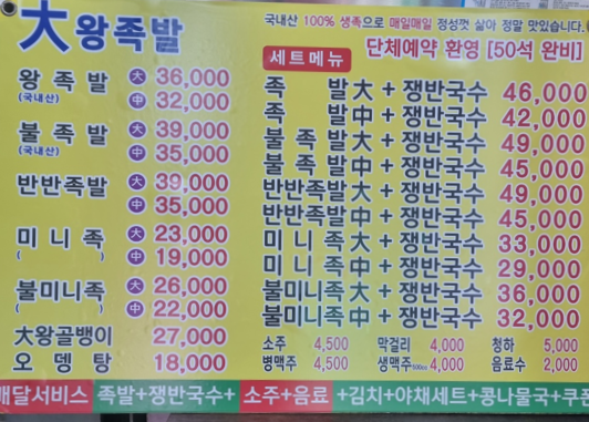 메뉴입니다. 저희는 3명이서 족발 中+쟁반국수 세트를 주문했습니다