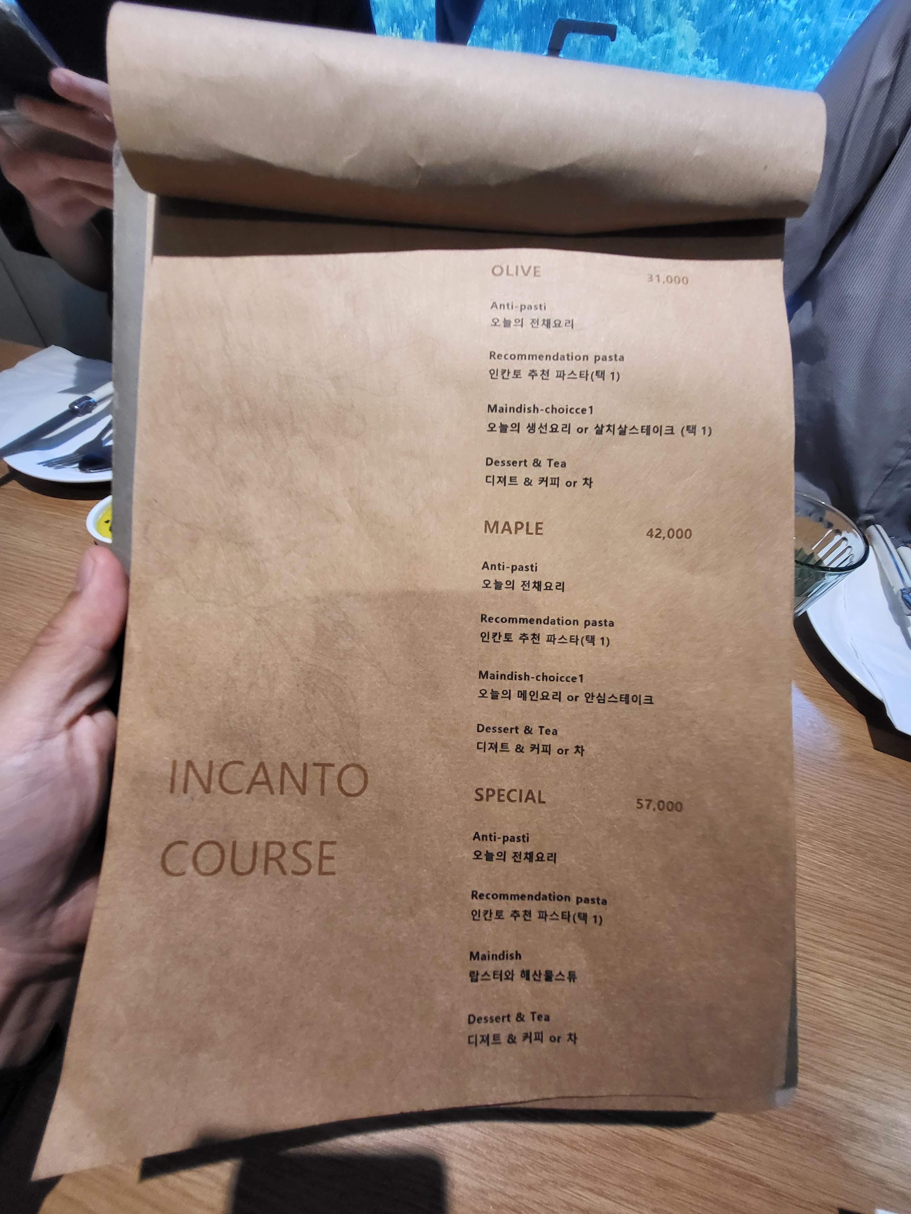 다양한 메뉴들이 있습니다. 저희는 오늘 OLIVE course를 주문했습니다. 파스타는 두가지 종류 중이 선택할수 있습니다. 이날은 해물파스타와 라구파스타를 고를 수 있었고 메인은 대구살 스테이크와 살치살 스테이크 중 하나를 고를 수 있었습니다.