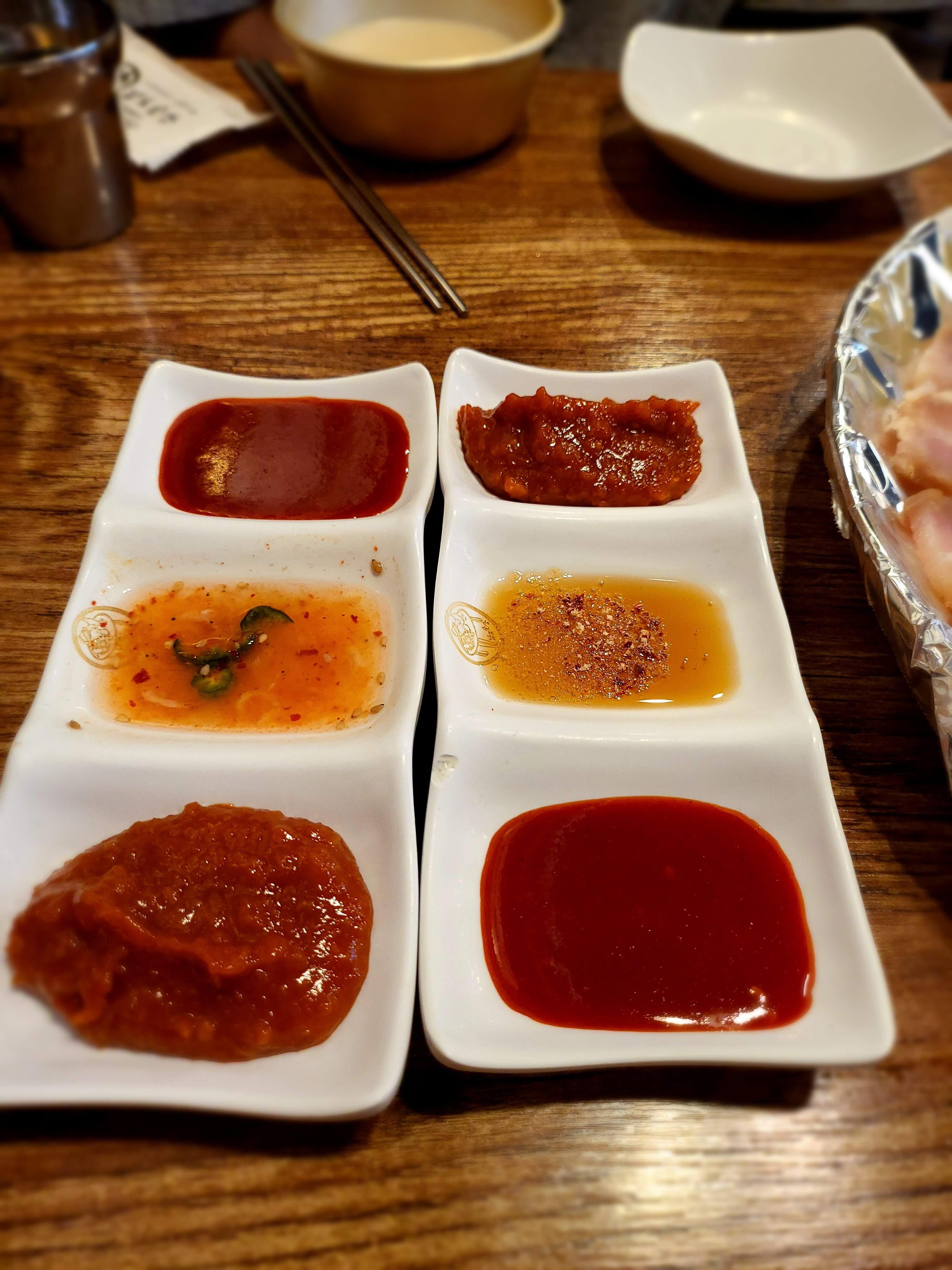 함께나온 소스들입니다. 쌈장, 초장, 기름장, 새우젓의 구성입니다.