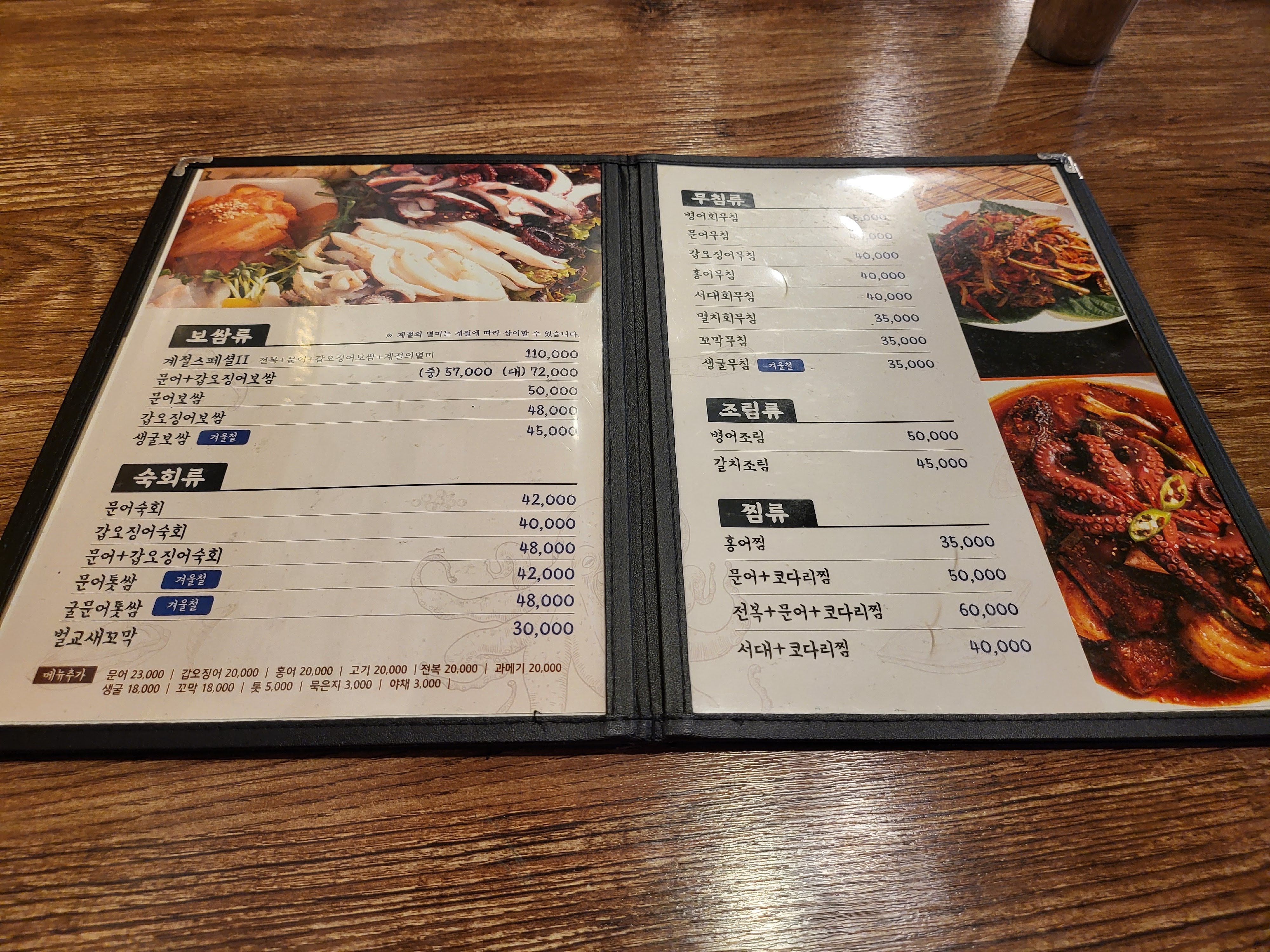 메뉴판입니다. 저희는 우선 특(문어+갑오징어+홍어삼합)을 주문했습니다.