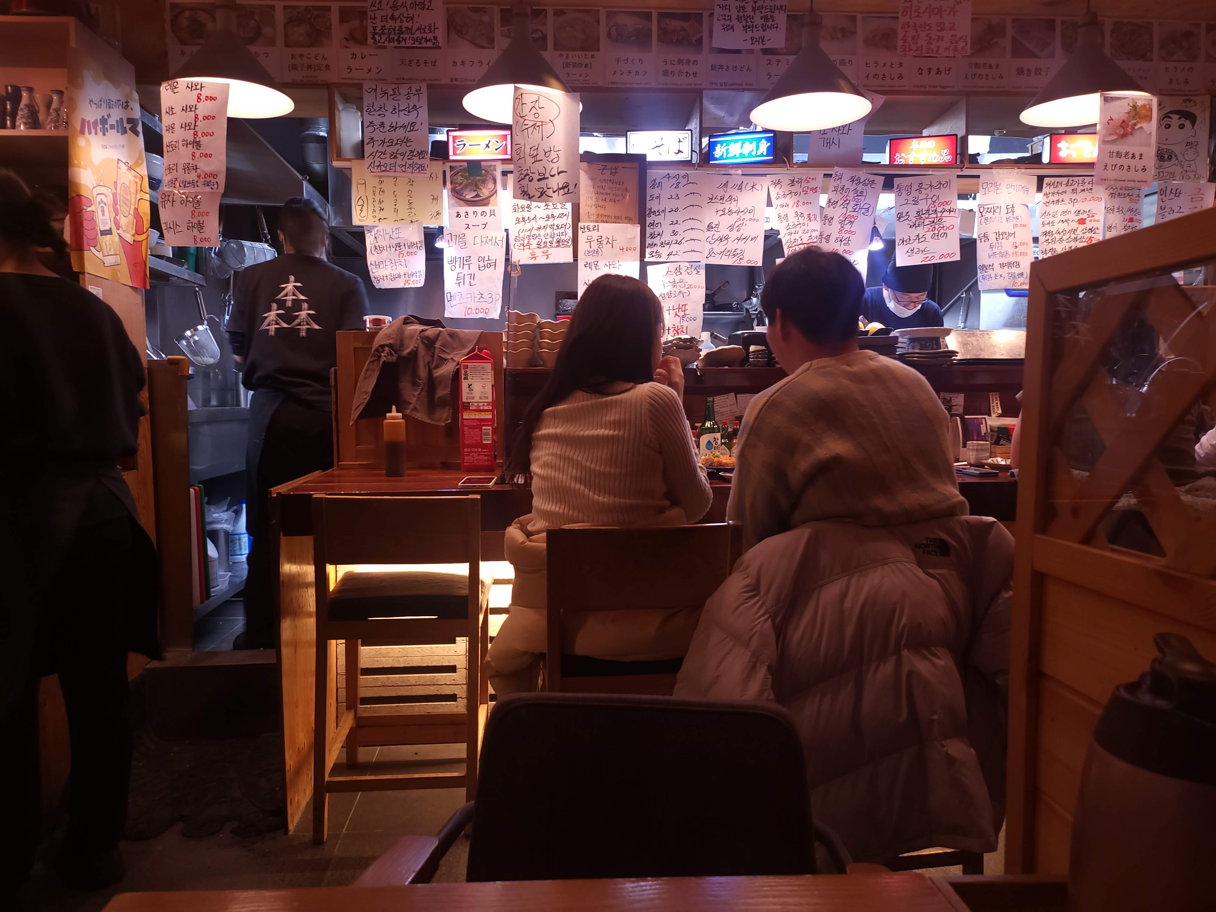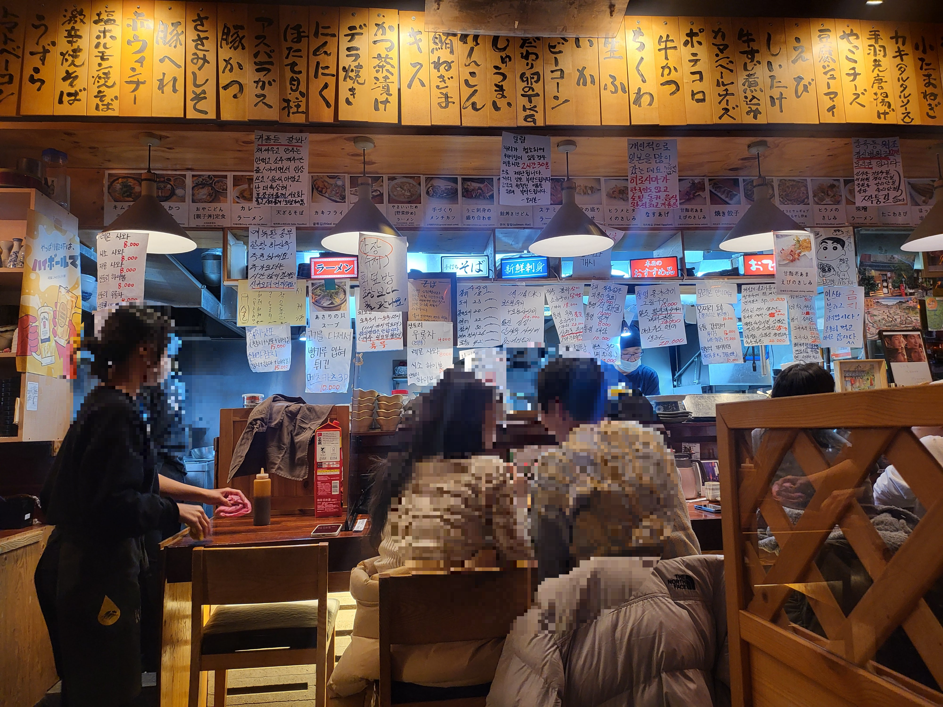 내부의 분위기 입니다. 아주 다양한 메뉴들이 있었습니다. 하얀 종이에 대충 휘갈겨쓴 각종 메뉴판(?)들이 인상깊었습니다. 바(bar)자리가 조금 있고 테이블이 6~7개 정도 있는 것 같았습니다. 2~30대의 손님들이 많았고 시끌벅적했습니다. 그래도 대화하는데 큰 문제는 없었습니다.